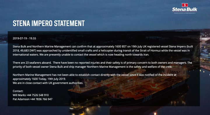 “Actualmente no podemos contactar con la embarcación, que se dirige hacia el norte, en dirección hacia Irán”, afirmó la naviera, que detalló que no tiene información sobre ningún herido en el incidente. “La prioridad tanto del dueño de la embarcación, Stena Bulk, como del operador del barco, Northern Marine Management, es la seguridad y el bienestar de la tripulación”, agrega la nota de la naviera.