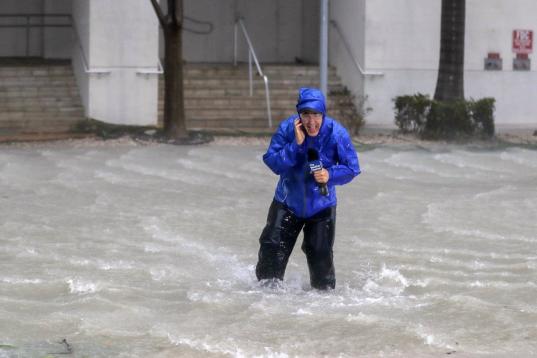 Mike Seidel, meteorólogo de The Weather Channel, retransmite los efectos de Irma mientras lucha contra sus consecuencias en las calles de Miami, el 10 de septiembre de 2017.