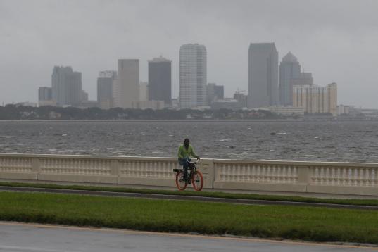 El skyline de la ciudad de Tampa al fondo mientras un hombre pasea en bicicleta por Bayshore Boulevard, el 10 de septiembre de 2017.
