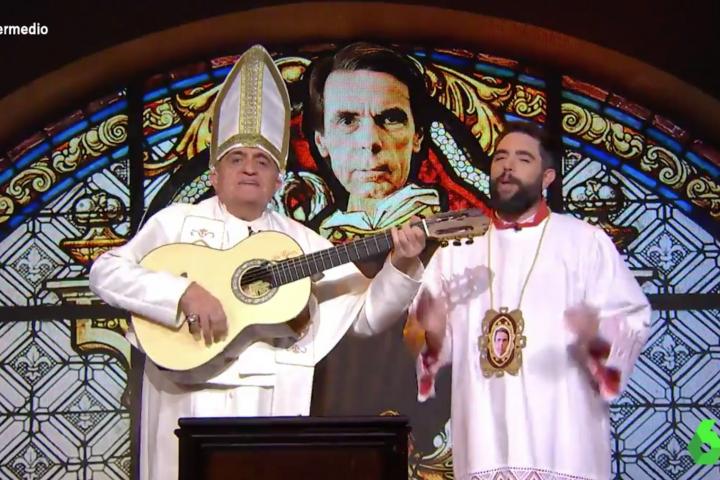 Los presentadores del programa El Intermedio —de laSexta–, El Gran Wyoming y Dani Mateo, se han convertido de nuevo en papa y monaguillo, respectivamente, de ‘la iglesia Aznariana’ para ironizar sobre las últimas palabras del expresidente del Gobierno, José María Aznar, quien el pasado martes criticó en un acto de FAES que algunos quieran “ganar 80 años después guerras que los españoles han olvidado y estigmas que no sienten”, en relación a la exhumación del dictador Francisco Franco.