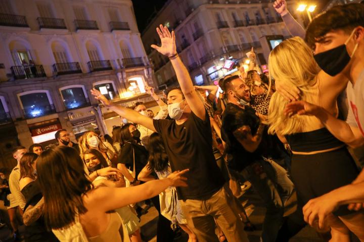 No había llegado la medianoche y en las calles de Madrid ya había cientos de personas celebrando el fin del estado de alarma sin mascarilla y sin respetar la distancia de seguridad.