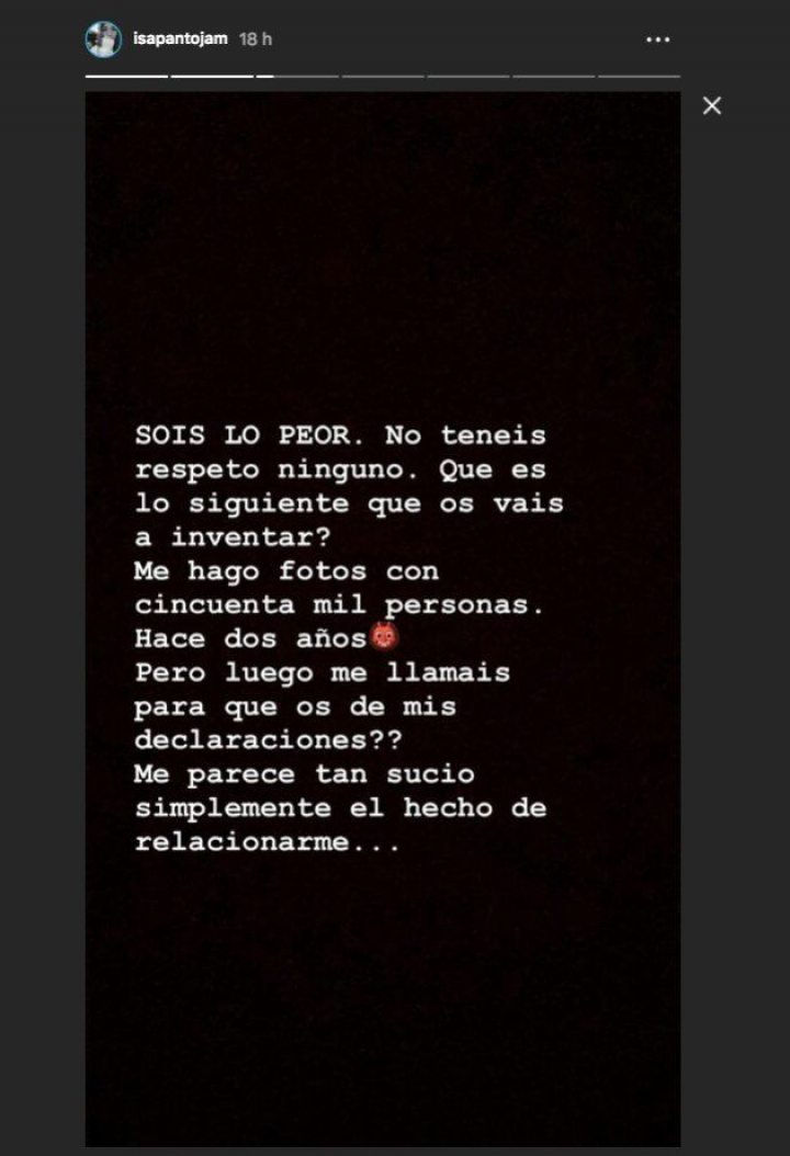 "SOIS LO PEOR. No tenéis respeto ninguno. ¿Qué es lo siguiente que os vais a inventar?", comienza el mensaje de la hija de la afamada tonadillera. "Me hago fotos con cincuenta mil personas", apunta antes de recalcar que la instantánea es de hace dos años. "Me parece tan sucio simplemente el hecho de relacionarme...", añade la joven, de 22 años.