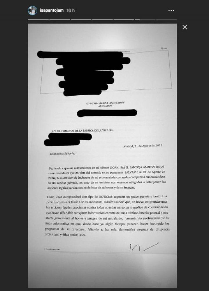 A tenor de la imagen que Pantoja colgó a continuación, va a emprender acciones legales contra el programa "en defensa de su honor y de su imagen".
