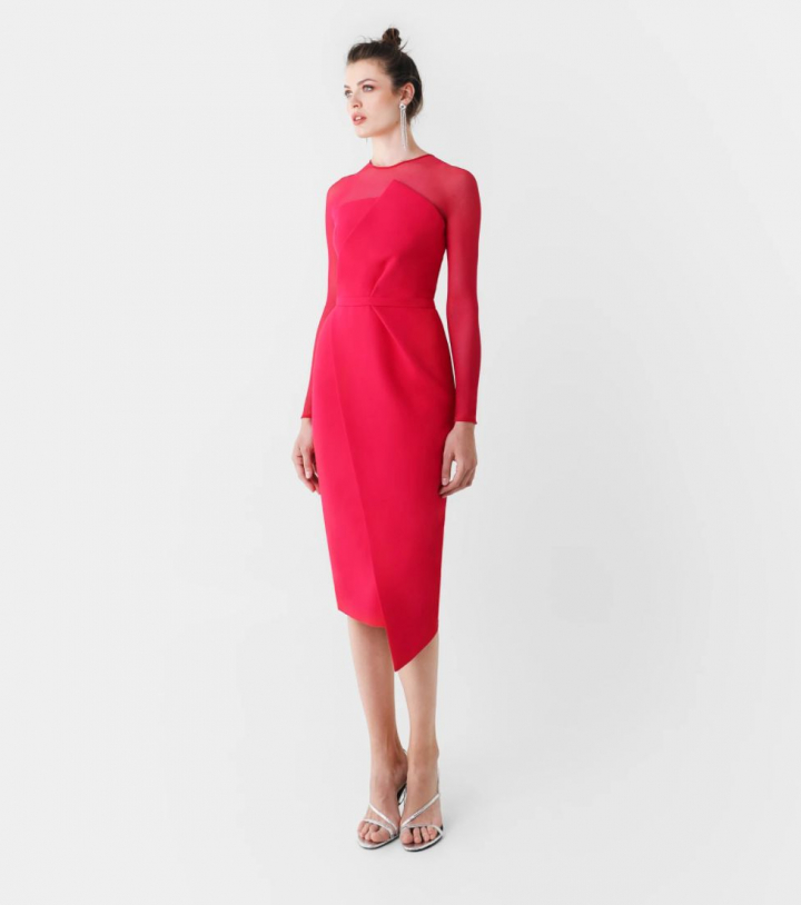 Se trataba de uno de los diseños de invitada de la firma. Concretamente es el modelo Jimena, un vestido en crepé y tul con volumen armado en la parte superior y falda cruzada. Su precio es de 207 euros y está rebajado —el precio original era de 295 euros—.