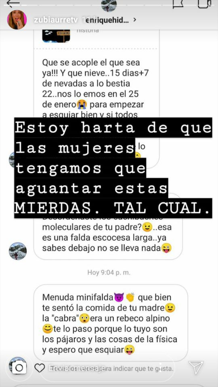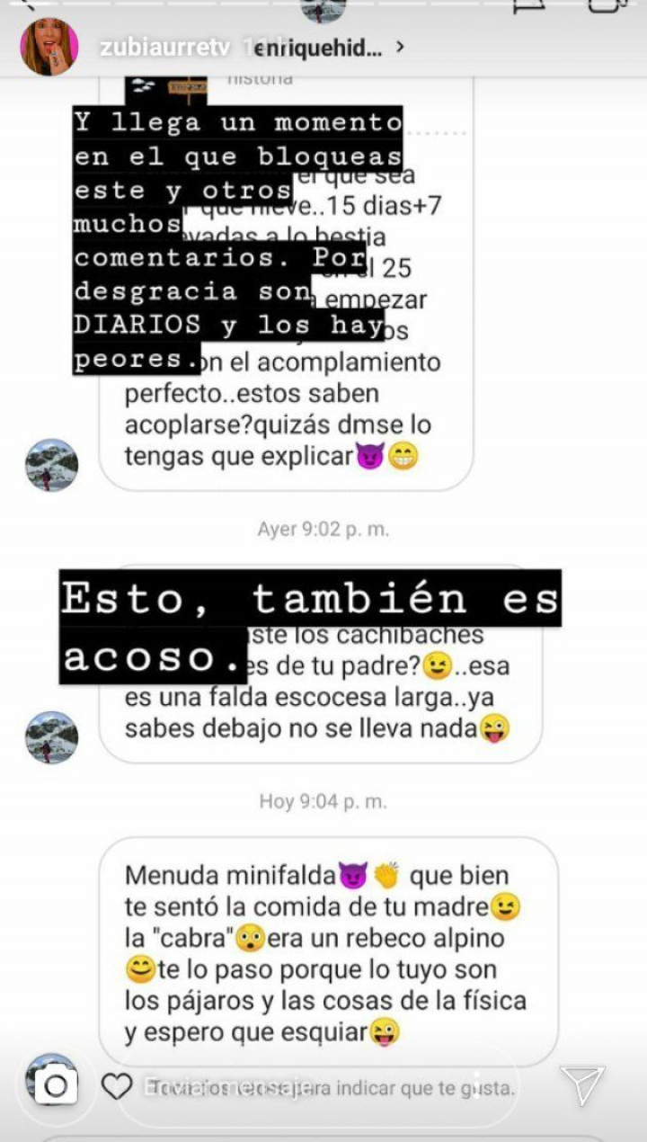 "Menuda minifalda, qué bien te sentó la comida de tu madre", se puede leer en una de las capturas que publicó Zubiaurre en dos de sus stories de Instagram.