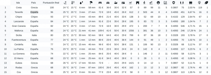 Solo en el top 10 de este ranking se posicionan seis islas españolas. El primer puesto de la clasificación lo ocupa la isla griega de Creta, seguida de Tenerife y Chipre. Tras estas, se encuentran otras cinco islas españolas: Lanzarote (4º), Gran Canaria (5º), Mallorca (6º), Fuerteventura (8º) y La Palma (10º).