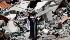 Dos mujeres miran lo que queda entre los escombros de su casa en Gaza.