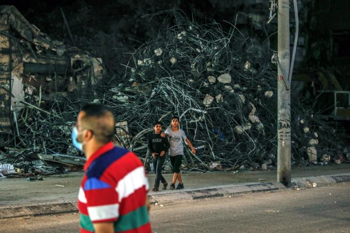 Un joven palestino camina sobre los escombros de la torre Al-Jawhara en la ciudad de Gaza, gravemente dañada, en la ciudad de Gaza