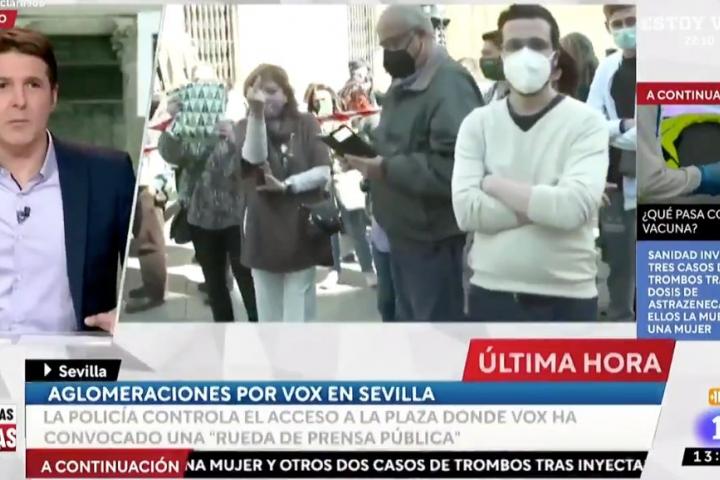 Una reportera del espacio de mediodía del ente público se ha desplazado hasta Sevilla donde el líder de Vox, Santiago Abascal, ha convocado una “rueda de prensa pública”.