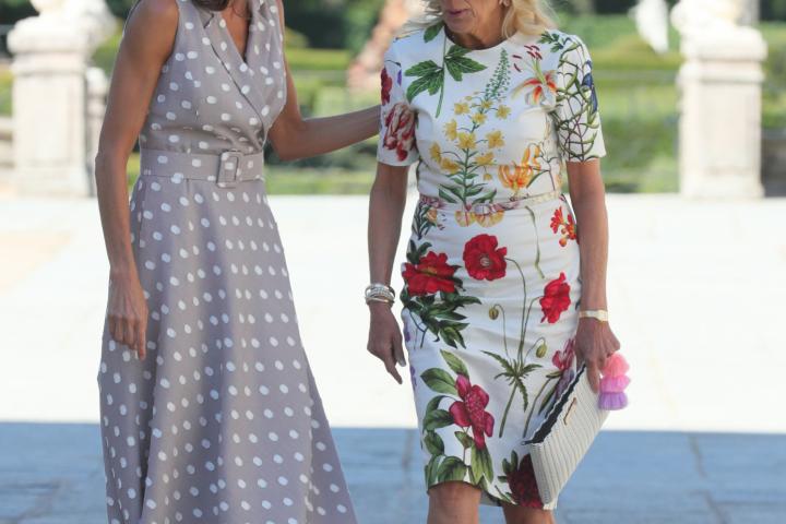 En la jornada del martes, junto a las otras consortes de los mandatarios, estuvieron en el Real Sitio de La Granja de San Ildefonso viendo el Palacio Real —cuya foto ilustra el tuit que dedica a la reina—, los jardines y la Real Fábrica de Cristales, y, posteriormente, vieron el Guernica de Picasso en el Museo Reina Sofía.