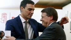 El líder de los socialistas valencianos, Ximo Puig, se ríe con Pedro Sánchez, el 16 de julio de 2014 tras ser elegido secretario general. Lo había apoyado en la consulta. Puig dimitiría dos años más tarde de la Ejecutiva y votaría en su ...
