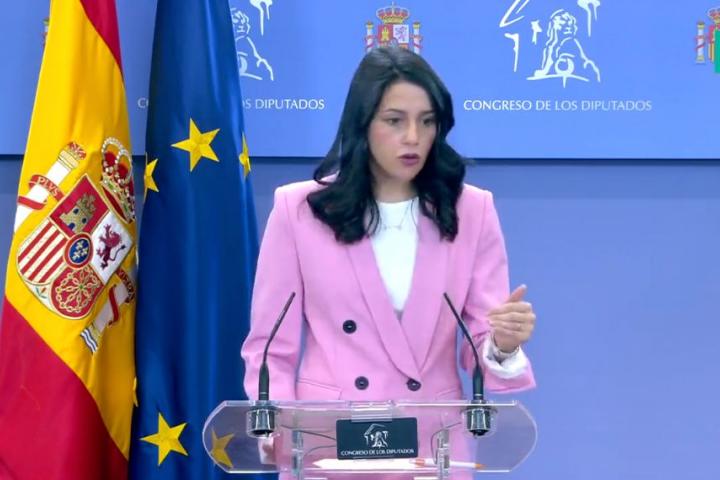 La líder de Ciudadanos compareció ante los medios de comunicación para decir que Pedro Sánchez “está dando un autogolpe a la democracia española desde el Gobierno de España. Y Sánchez ya no es un presidente del gobierno, es un aprendiz de dictador al que tenemos, con fuerza, que pararle los pies”.