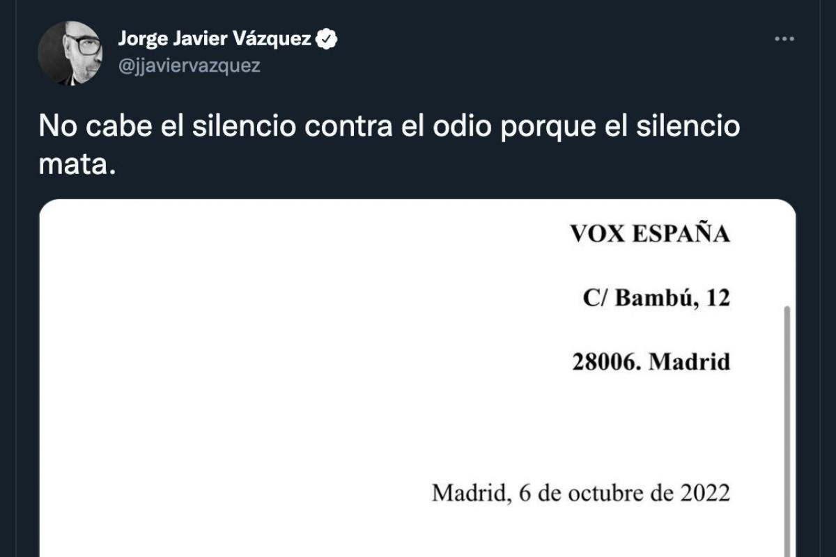 En respuesta a los acontecimientos, Jorge Javier Vázquez, presentador de televisión y víctima del cántico, ha enviado este jueves 6 de octubre un escrito a la Sede Nacional de Vox España que posteriormente ha publicado en su cuenta de Twitter (@jjaviervazquez) para hacerlo público y que quede constancia.