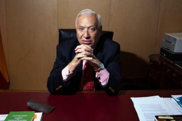 El despacho de José Manuel García-Margallo en el Congreso está presidido por una fotografía del rey Felipe VI. Detrás de su mesa, una gran bandera de España en un mástil. La correa de su reloj es roja y amarilla. Sobre su mesa se apilan decenas de libros y de papeles.