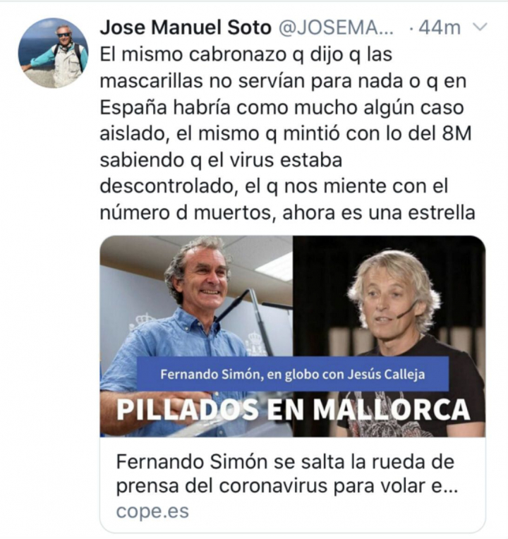 “El mismo cabronazo que dijo que las mascarillas no servían para nada o que en España habría como mucho algún caso aislado, el mismo que mintió con lo del 8M sabiendo que el virus estaba descontrolado, el que nos miente con el número de muertos, ahora es una estrella”, ha escrito Soto en un mensaje de Twitter que borró unos minutos después.