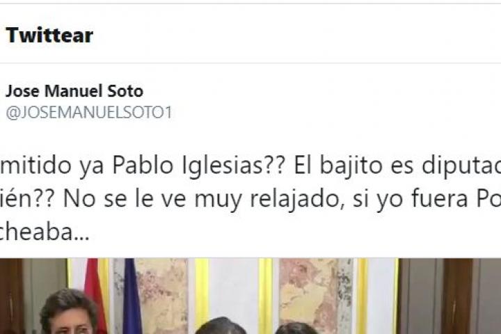 En esas imágenes antiguas recogidas por Europa Press se puede ver a Iglesias y a un grupo de diputados hablando del aforamiento del jefe del Estado. Sobre ese vídeo, Soto ha comentado: “Ha dimitido ya Pablo Iglesias?? El bajito es diputado también?? No se le ve muy relajado, si yo fuera Policía lo cacheaba...”.
