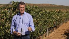 Feijóo analizando atentamente algo durante una visita a una cooperativa vinícola en Villarrobledo.