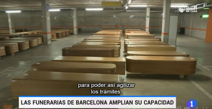 Falso: esas imágenes corresponden al parking del tanatorio de Collserola y TVE las emitió en el telediario de las 15:00 (min. 11:45), el 2/04/2020. Y así, todo. https://t.co/p7yZGYOy9o