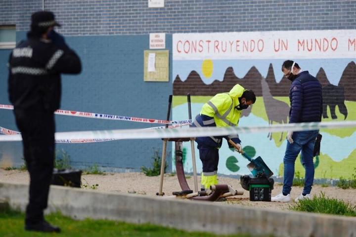 Efectivos del servicio de limpieza del Ayuntamiento y de la policía investigan en el parque de Laguna de Duero (Valladolid) donde este jueves ha aparecido el cuerpo sin vida de un joven con un golpe en la cabeza. EFE/ Nacho GallegoEFE