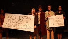 Igualmente, es una buena idea esa separación entre cielo y tierra. Entre la suciedad y el hacinamiento de la vida terrenal en común y el etéreo cielo de los dioses, que en este espectáculo es de las diosas. Vírgenes rubias y doradas que flotan sobre ese pueblo, malhablado, gritón y maloliente.