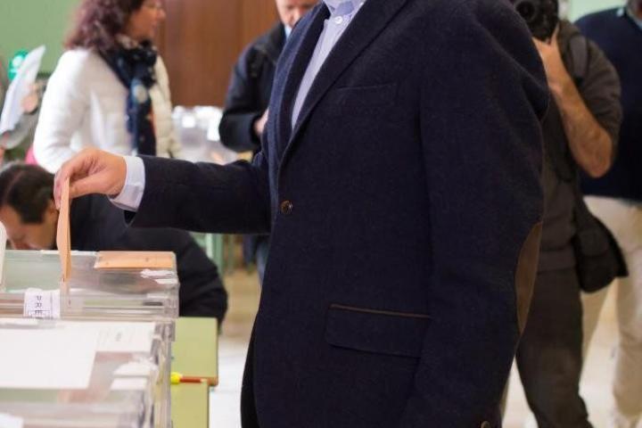 El presidente de la Junta de Andalucía, Juanma Moreno, ejerciendo su derecho al voto en el colegio Sagrado Corazón de la capital malagueña, hoy 10 de Noviembre. EFE/Carlos DíazEFE