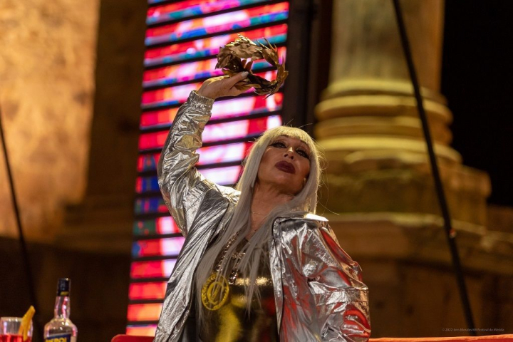 Pero, claro, es que no conocen a Moria Casan. La celebrity de esta función. Y harán mal si no van a conocerla. Esa mujer que, a ojos españoles, parece salida de la serie Veneno, interpreta a Julio César. Un Julio César con hechuras de mujer que no solo se ha recauchutado hasta la médula, sino que está a la última en tendencias, ella misma es una tendencia.