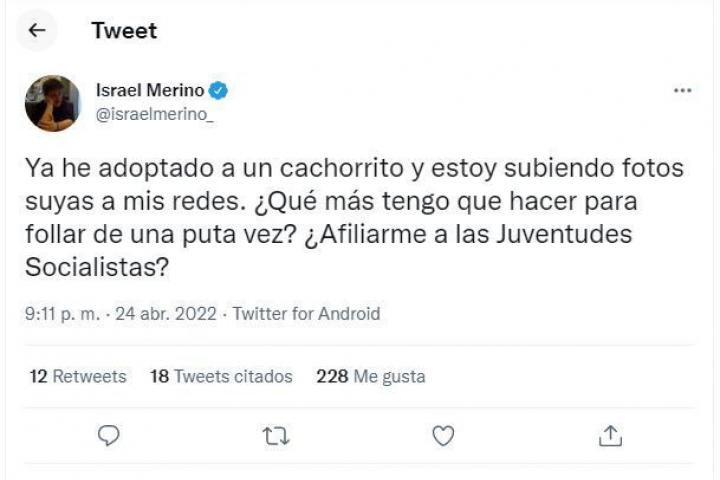 “Ya he adoptado a un cachorrito y estoy subiendo fotos suyas a mis redes. ¿Qué más tengo que hacer para follar de una puta vez? ¿Afiliarme a las Juventudes Socialistas?”, se preguntaba en su tuit el periodista Israel Merino.