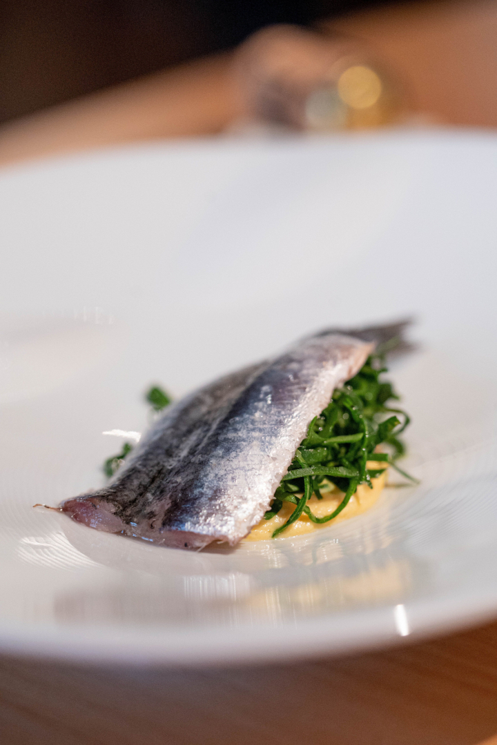 Se encuentra en un pequeño callejón, entre la catedral y la alcazaba, a escasos cinco minutos andando de su otro restaurante. Un espacio estrecho y con ciertos recovecos que termina en una barra de cocina. Decoración sobria, minimalista, casi nórdica, la que se estila actualmente en los restaurantes. La primera elección que tomar es el menú que queremos degustar. Centan con tres longitudes diferentes, con unos precios de 50, 65 y 75 euros. En esta ocasión nos vamos al medio, llamado ‘Notas’ y compuesto de 12 pases diferentes.