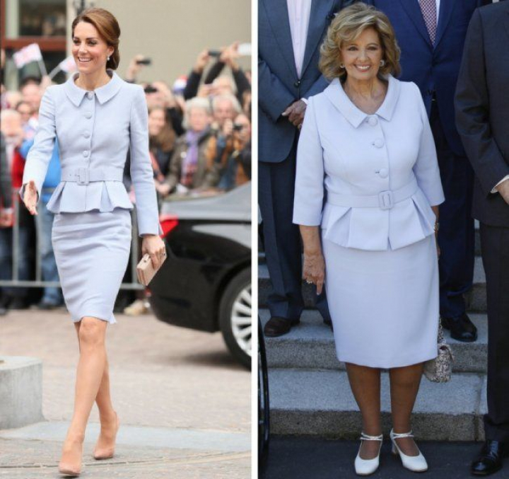 Dados esos antecedentes, puede que no parezca tan surrealista que la duquesa de Cambridge y María Teresa Campos coincidan con el mismo conjunto. Kate vistió un traje de chaqueta y falda en tonos gris perla en su primera visita oficial en solitario al extranjero el pasado mes de octubre, mientras que la presentadora malagueña lució un traje prácticamente igual en Moncloa cuando recibió la Medalla de Oro del Mérito en el Trabajo la semana pasada.