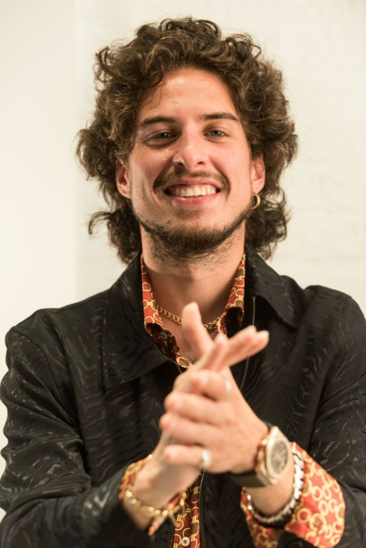 El cantaor nos recibe en las oficinas de su compañía, Universal Music, vestido con un vaquero pitillo negro, zapatillas y camisa blanca, y luciendo su característica melena rizada castaña clara. Lleva un aro de oro en una oreja y las gafas de sol que se quita y se pone parecen servirle de escondite.