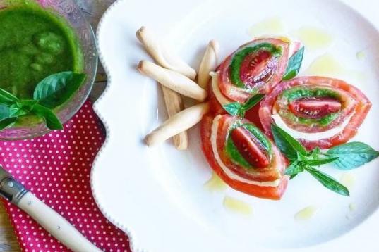 Con productos de la huerta, pesto casero y algo de imaginación se pueden preparar platos tan bonitos y sabrosos como éste. Los pasos para preparar esta original ensalada los encuentras aquí.