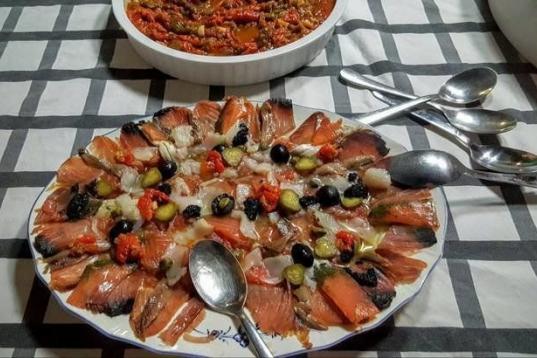 Se monta sobre un lecho de tomate rallado. Encima va una capa de carpaccio de bacalao y, sobre éste, anchoas, boquerones en vinagre, mojama, hueva y aceitunas negras. Tienes todos los detalles de su preparación aquí.