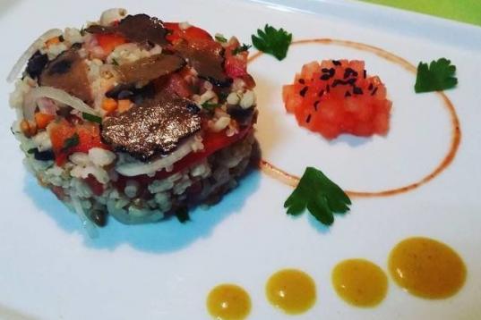 La base de esta receta es una mezcla de quinoa y arroz integral, acompañada por chalota, pimiento rojo, aceitunas negras, tomates y zanahoria. Puedes revisar cómo se elabora aquí.
