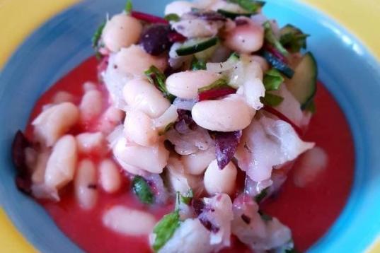 A priori, la mezcla de ingredientes te sorprenderá —pescado con alubias blancas, fresas, tomates cherry, aceitunas, pepino y acelgas— pero merece la pena probar esta propuesta tan fresquita y original. Lee la receta en CookPad.