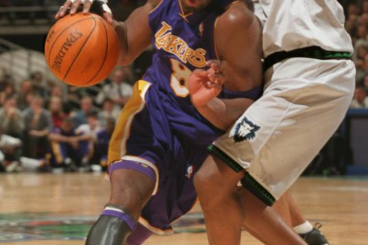 12/17/99, Timberwolves vs. L.A. Lakers. -- The Lakers Kobe Bryant drives around the Wolves Anthony Peeler in second-half action. Bryant scored 28 points to lead the Laker scoring.(Photo By MARLIN LEVISON/Star Tribune via Getty Images)