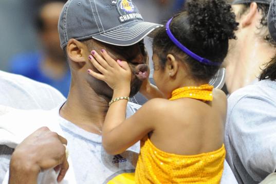 Kobe Bryant of the Los Angeles Lakers celebrates victory with his daughter following Game 5 of the NBA Finals against the Orlando Magic at Amway Arena on June 14, 2009 in Orlando, Florida. The Lakers won the National Basketball Association champ...