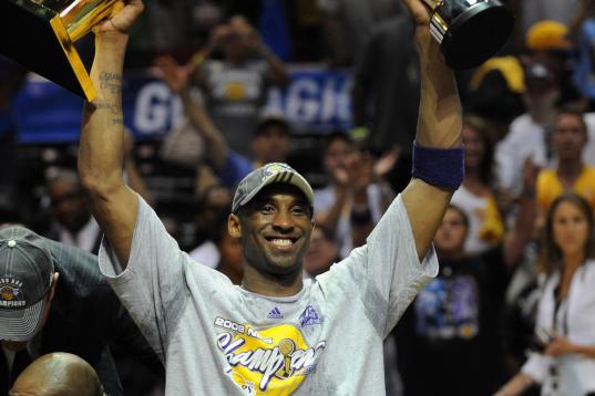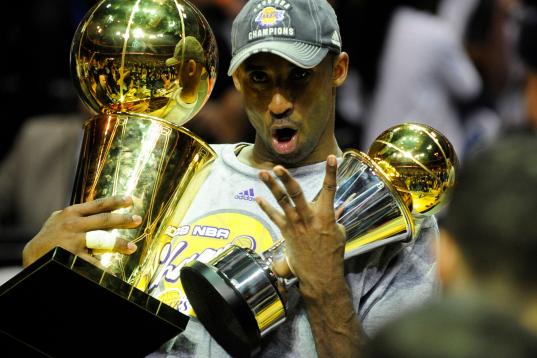 Kobe Bryant of the Los Angeles Lakers celebrates victory following Game 5 of the NBA Finals against the Orlando Magic at Amway Arena on June 14, 2009 in Orlando, Florida. The Lakers won the National Basketball Association championships defeating...