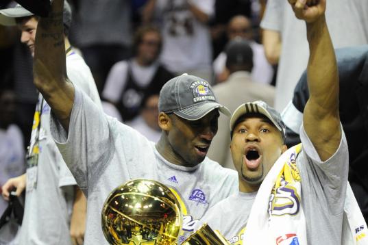 Kobe Bryant (L) and Derek Fisher celebrate after defeating the Orlando Magic in Game 5 of the NBA finals at Amway Arena on June 14, 2009 in Orlando, Florida. The Lakers won the National Basketball Association championships defeating Orlando 99-8...