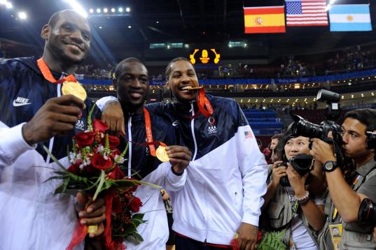 (HR) ABOVE: Carmelo Anthony, right, bites down on his medal with teammates Dwyane Wade, middle and Lebron James, left. The U.S. men's basketball team won the gold medal at the Beijing 2008 Olympic Games with a 118-107 victory over Spain Sunday a...