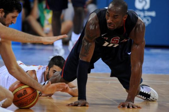 (HR) ABOVE: Kobe Bryant scrambles for the ball against Spain's Juan Carios Mavarro in the second half of the game. The U.S. men's basketball team won the gold medal at the Beijing 2008 Olympic Games with a 118-107 victory over Spain Sunday after...