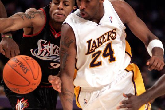 Lakers' Kobe Bryant drives past 76ers' defender Andre Iguodala in the fourth quarter of play during the Lakers' 10494 win Sunday, December 31, 2006 at Staples Center. (Photo by Myung J. Chun/Los Angeles Times via Getty Images)