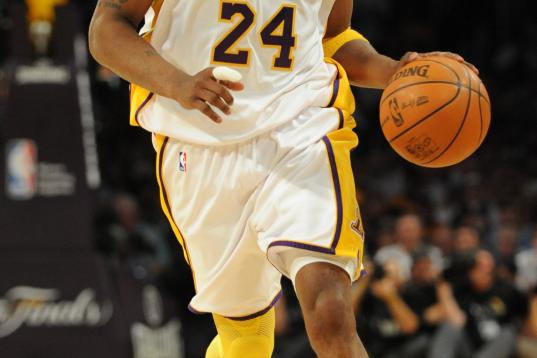 LA Lakers guard Kobe Bryant dribbles the ball before the Boston Celtics went on to win 103-94 in game two of the NBA finals at the Staples Center in Los Angeles on June 6, 2010. The defending champion Los Angeles Lakers are not only seeking the...