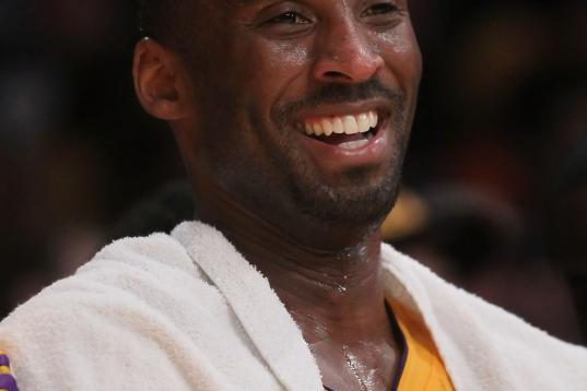 LOS ANGELES, CA - DECEMBER 29: Kobe Bryant #24 of the Los Angeles Lakers smiles from the bench against the New York Knicks at Staples Center on December 29, 2011 in Los Angeles, California. NOTE TO USER: User expressly acknowledges and agrees t...