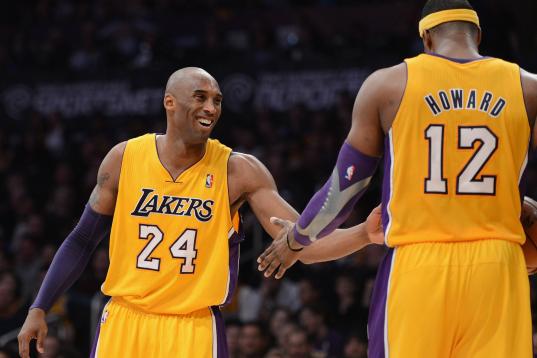 LOS ANGELES, CA - DECEMBER 28: Kobe Bryant #24 of the Los Angeles Lakers jokes with Dwight Howard #12 during the game against the Portland Trail Blazers at Staples Center on December 28, 2012 in Los Angeles, California. The Lakers won 104-87. ...