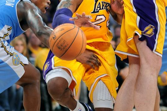 Lakers Kobe Bryant squeezes by Nuggets Al Harrington and Pau Gasol while dribbling at the Staples Center Saturday. (Photo by Wally Skalij/Los Angeles Times via Getty Images)