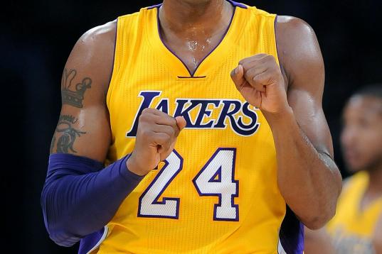 LOS ANGELES, CA - DECEMBER 29: Kobe Bryant #24 of the Los Angeles Lakers gestures against the New York Knicks at Staples Center on December 29, 2011 in Los Angeles, California. NOTE TO USER: User expressly acknowledges and agrees that, by downl...