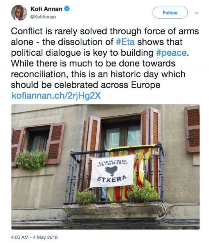 Tras borrarlo, Annan ha vuelto a tuitear otro mensaje, en el que asegura que "la disolución de ETA da la bienvenida al final de un difícil capítulo de la historia de España" y repite el mensaje que acompañaba al tuit anterior abogando por el "diálogo". En esta ocasión, el mensaje fue acompañado por una imagen de la declaración leída este viernes en Cambo.