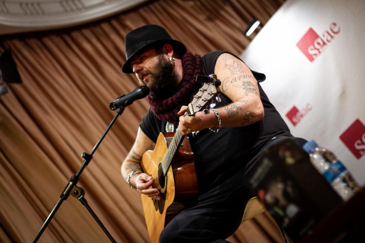 Vestido con una camiseta sin mangas que deja ver todos los tatuajes que cubren su cuerpo, con su clásico sombrero, con un foulard al cuello y en chándal (dice que los vaqueros “son una mierda porque en verano dan calor y en invierno dan frío”) se sienta ante las cámaras de ElHuffPost en el palacete que tiene la SGAE en el centro de Madrid.