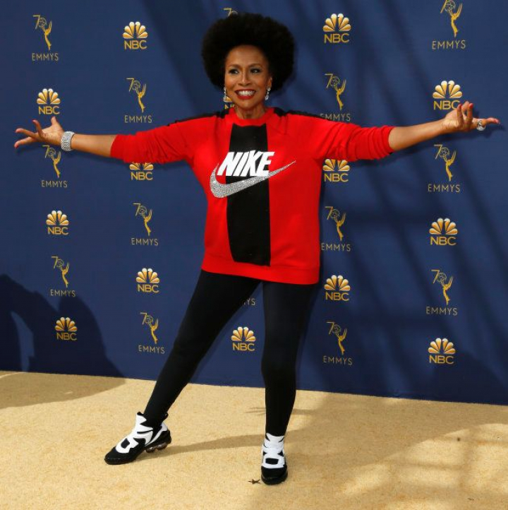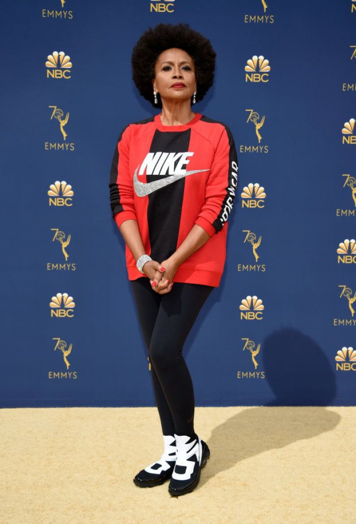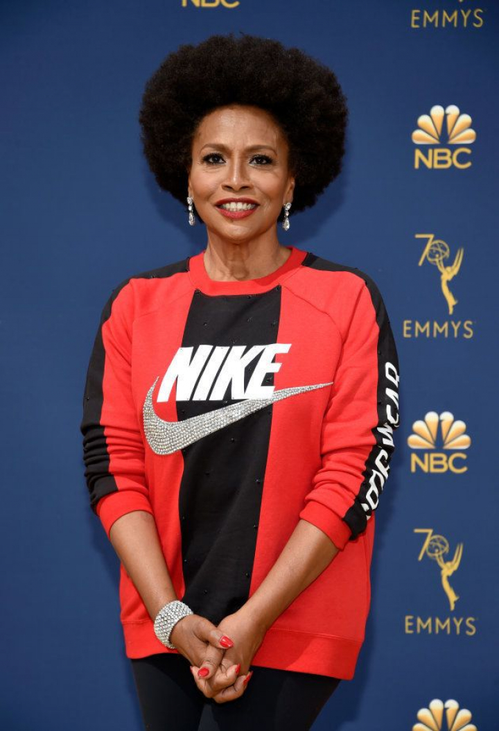 La actriz Jenifer Lewis, protagonista de Black-ish, serie que optaba a cuatro de las principales categorías, se ha engalanado con una sudadera que recuerda a un uniforme de fútbol americano para mostrar su apoyo a Nike por apoyar, a su vez, al jugador Colin Kaepernick.
