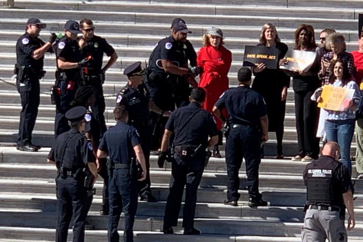 La octogenaria actriz Jane Fonda fue arrestada hoy en las escalinatas del Congreso de Estados Unidos junto con un grupo de manifestantes que reclamaban decisiones del Gobierno para contrarrestar el cambio climático.